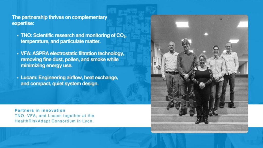 Tijdens het healthRiskAdapt Consortium in Lyon presenteerden VFA, TNO en Lucam samen een visie die verder gaat dan standaard ventilatie: een geïntegreerd, toekomstbestendig systeem dat luchtkwaliteit, comfort én energie-efficiency combineert.